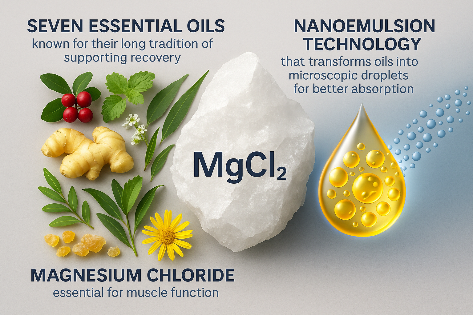 This 60ml spray blends seven therapeutic essential oils (Frankincense, Wintergreen, Ginger, Camphor, Japanese Peppermint, Eucalyptus Radiata, and Arnica) with magnesium chloride, delivered through advanced nanoemulsion technology. The result is a spray that goes on clean, absorbs quickly, and is always ready when you need it most.